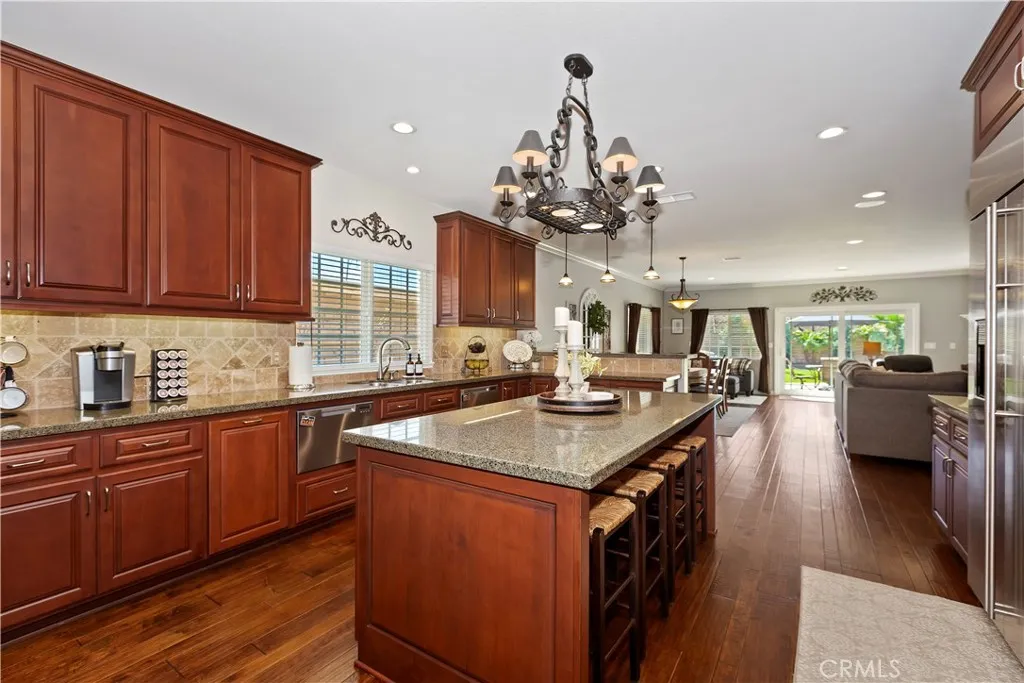 Beautiful single-level customized home in the heart of La Verne. Welcome to this stunning single-story home located in the center of La Verne. From the moment you enter, youre greeted by a spacious entry featuring 9 foot ceilings, engineered wood flooring, a glass-accented front door, and elegant crown molding that flows into the open-concept living areas. The expansive living room offers crown molding, recessed lighting, an over- sized gas fireplace with mantle, and a sliding glass door that opens to the rear patio creating the perfect space for both relaxing and entertaining. The chefs kitchen is truly impressive, boasting custom cabinetry, granite countertops, a large island with bar seating, two in-cabinet dishwashers, a 48 inch cook top, double built-in ovens, built -in microwave, and a fully integrated refrigerator. The kitchen opens seamlessly to the formal dining and living areas. Just off the kitchen is a convenient office/study nook that leads to the direct access two car garage, and a separate laundry room with side yard access. Situated on the west side of the home are five generously sized bedrooms and three bathrooms, including two primary suites with private bathrooms. The main primary master features a large walk-in shower, separate Sani-jet pipeless hydrotherapy tub and a sliding door from the bedroom to the rear yard. All bedrooms feature wall-to-wall carpeting, closet organizers, ceiling fans and overhead lighting. Additional features include: Dual pained Milgard windows A finished attic storage room with pull downstairs located off the hallway (not incl