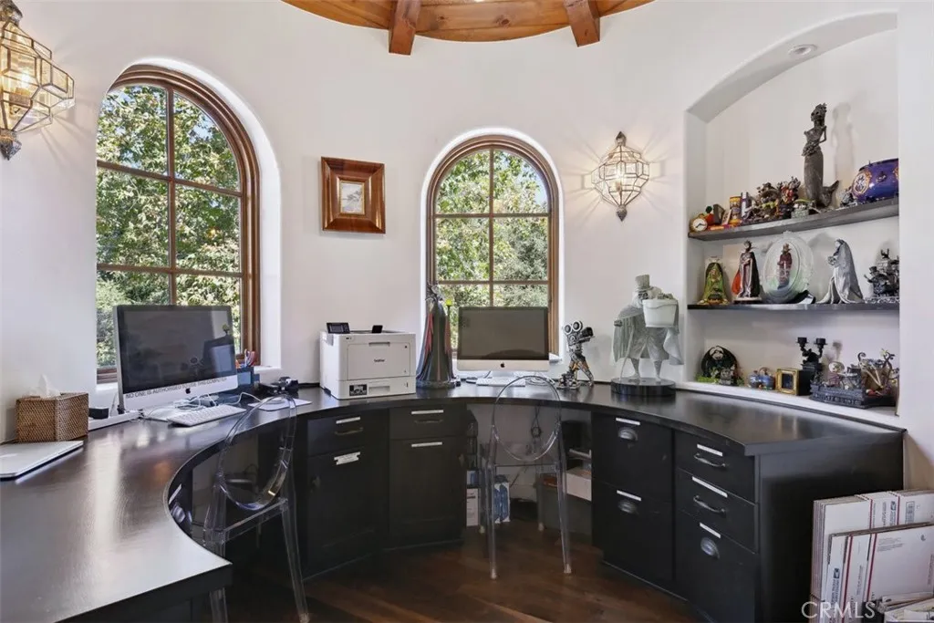 Welcome to Hacienda de Roble, A Timeless Custom Estate on 2 Acres of serene beauty. Nestled in the heart of nature, Set on 2 acres surrounded by majestic oak trees and rolling mountains, this one-of-a-kind property is a true sanctuary. A gated entrance and long circular driveway provide both security and ample parking space. Exquisite outdoor living by stepping outside to discover a variety of outdoor spaces. The flat, grassy yard is fully fenced, while stone patios, a vine-covered pergola, and a BBQ area set amidst lush botanical gardens creating the perfect backdrop for al fresco dining. Unwind in the outdoor hot tub, sip drinks at the wet bar by the creek, or gather around the fire pit for amazing sunsets. For the animal lovers, the property also includes small barns for goats, ducks, or chickens that enjoy a small flowing water feature. Designed by renowned architect Doug Burdge, the homes architecture is dramatic and inspiring. The great room features cathedral wood-beamed ceilings, a striking herringbone brick fireplace, and walls of glass that offer expansive views of the property. The gourmet kitchen is a chefs dream, boasting a massive natural stone island, Subzero refrigerator, Heston range, and Miele dishwashers. The adjacent bar area with a wine fridge and copper countertop is perfect for entertaining and butlers pantry with an additional refrigerator. A spacious family room flows seamlessly to one of the many outdoor patios, while an ensuite guest bedroom and multipurpose laundry room complete the main level. Luxurious primary suite ascend the custom tile and w