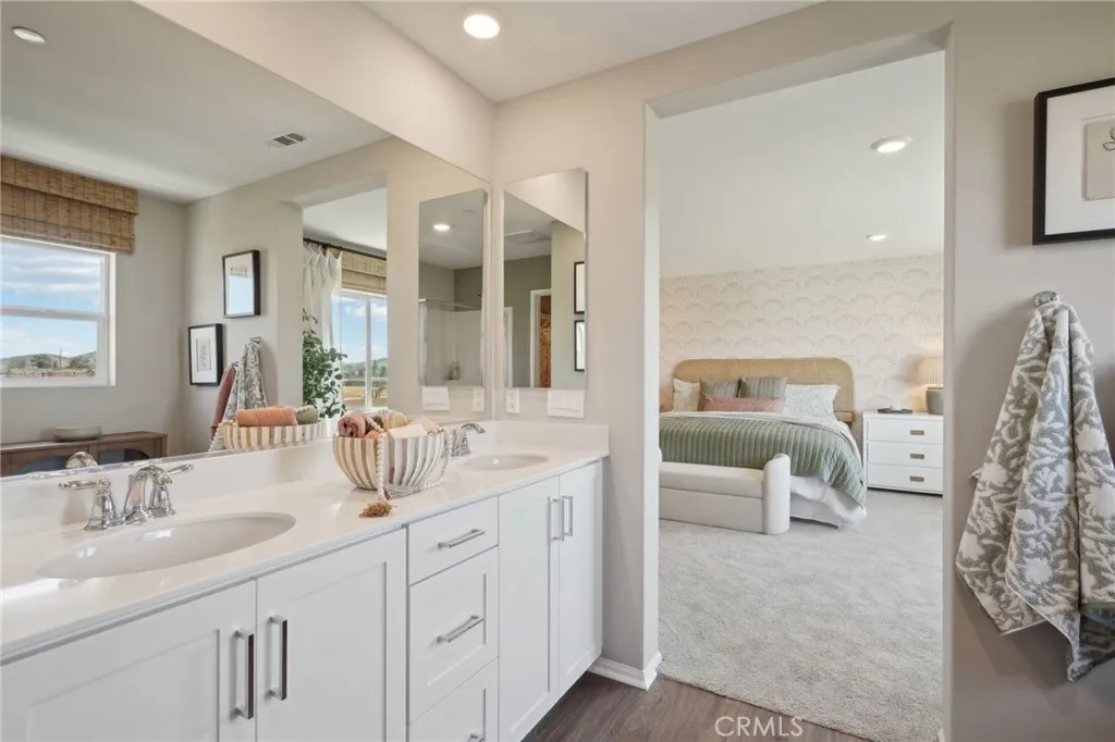 This 2,311-square foot California Tuscan two-story home, has 5 bedrooms, 3 bathrooms. One of the bedrooms with a walk-in closet and full bathroom is DOWNSTAIRS. The eat in kitchen island area has Bianco Tiza Quartz counters, built-in stainless-steel appliances and a pantry closet. There is white shaker-style cabinetry throughout, lots of included recessed lighting, plush carpet in bedrooms, closets, and stairs, and vinyl in main living areas! Upstairs is a primary bedroom with ensuite bathroom and walk-in closet, 3 additional bedrooms and full bathroom, and a laundry room. There is also a direct-access 2-car garage PRE-PLUMBED for an electric car! This truly modern home has all the Smart Home features you would expect and, is landscaped and irrigated in the front yard. The community is situated close to park and freeway access. This home will be ready to move in June of 2026.